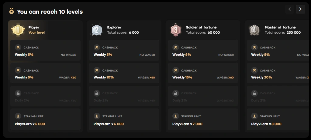 | Gold Level | Access to personalized bonuses, invitations to VIP tournaments, and other exclusive offers. |